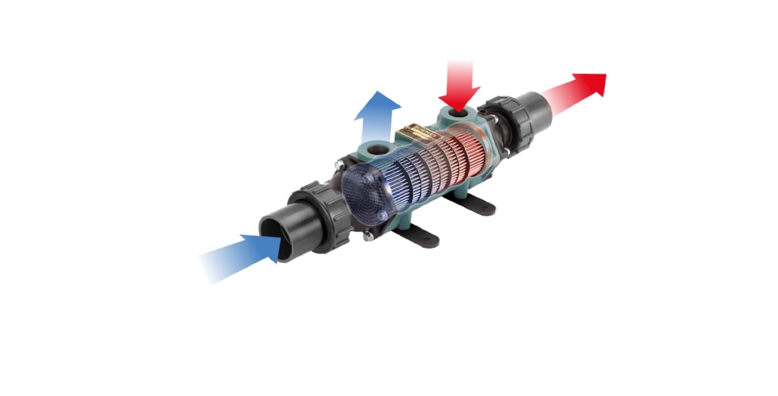 So, assuming you have the correct boiler or heat source for the size of the pool, the next thing to check is the heat exchanger. To go back to the home heating analogy, your house may have the largest, most efficient boiler, but if you’ve only got a few small radiators, it’s never going to heat the rooms up! That’s because surface area is vitally important. The more you have, the greater amount of heat can be transferred – either into a room via a radiator, or into a swimming pool via a heat exchanger.