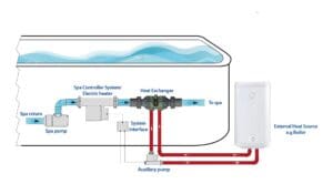 In addition to the boiler and heat exchanger, an electrical interface links with the spa control unit, monitoring water temperature and controlling the operation of the boiler.
